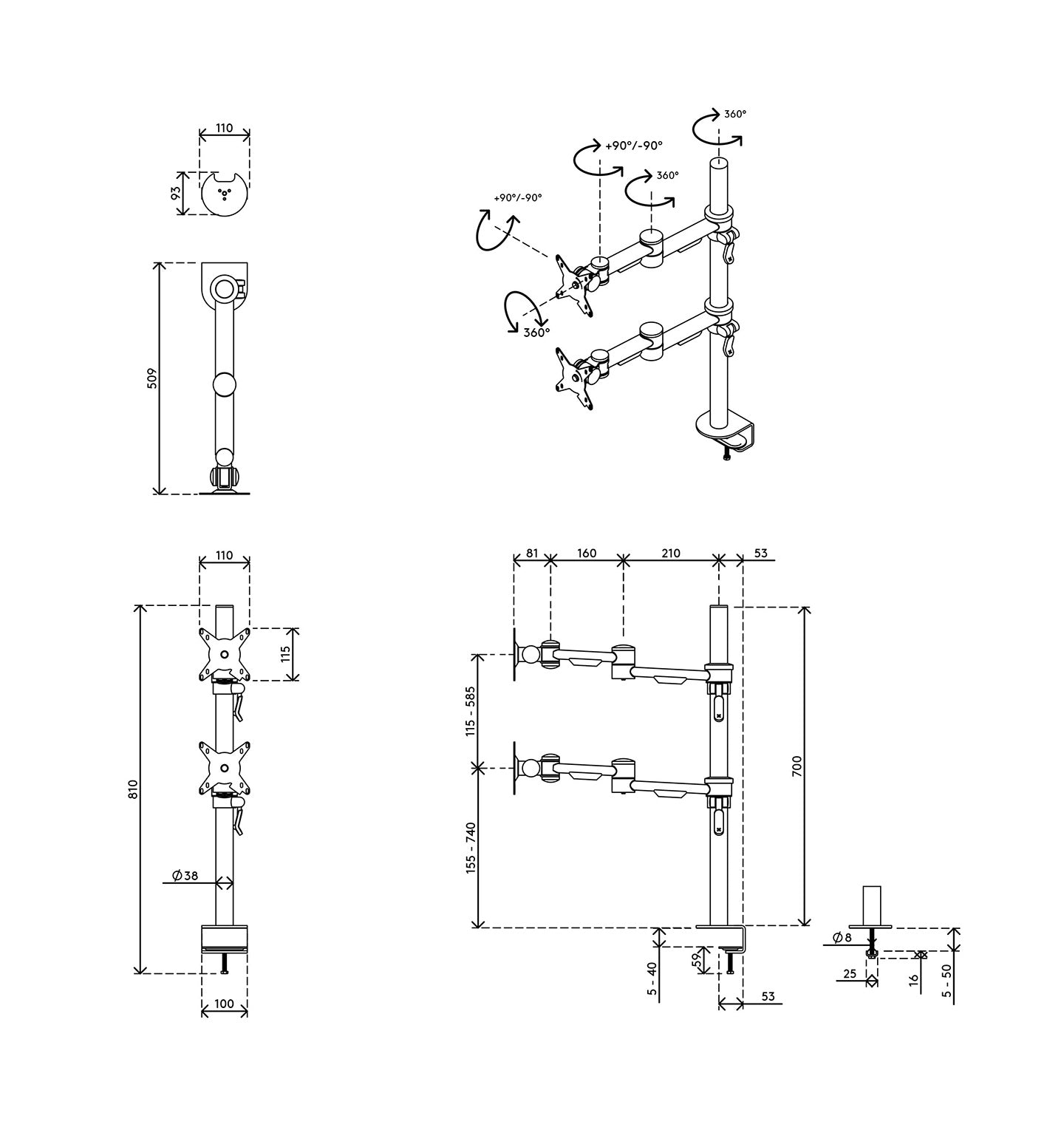 • Suitable for desk thicknesses of 5 to 40 mm (clamp) or 50 mm (through-desk)